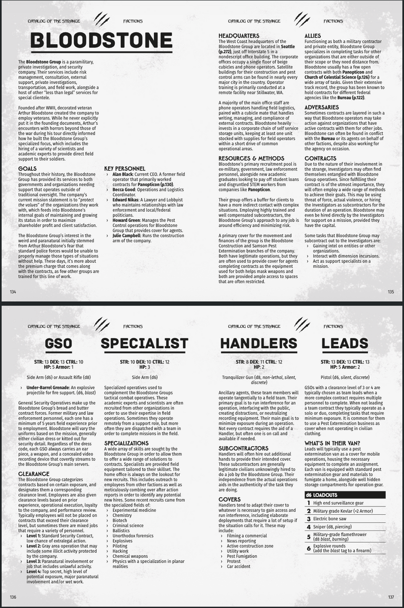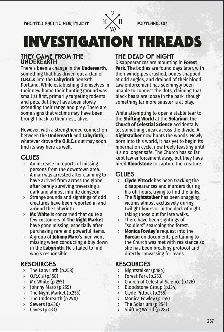 Investigation Threads act as a scenario framework, includes on overview of a conflict that is occurring and will eventually come to a head if nothing is done, a set of clues to seed in play, and a list of resources to expand the thread into a full blow scenario.