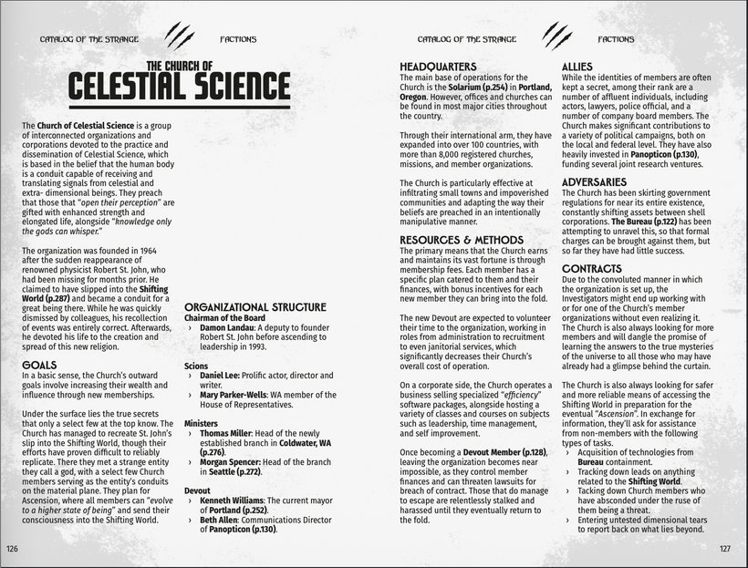 The Church of Celestial Science reaches out into many different areas, creating a lot of possible vectors for the players as they explore (which creates the needed time to elapse for Brea to begin her changes in the lead up to The Parthenogenesis of Hungry Hollow). Seed news of the Churches recent branch in Coldwater (this would lead to Stopover at the Shelterwood Inn and The Bloom) or set up the disappearances in Astoria, OR's Investigation Thread "Initiation" (p.285) to lead the Investigators straight into Cult Classic (p.318).