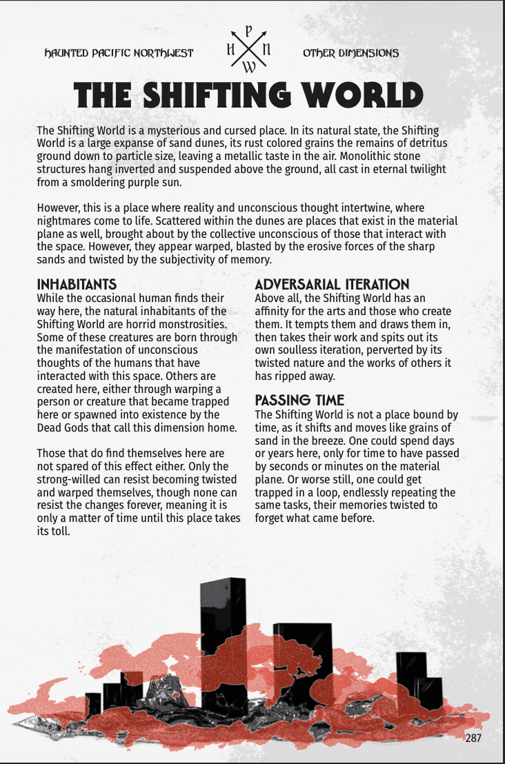 The Liminal Horror Deluxe Edition has a chapter devoted to the Haunted Pacific Northwest. The Haunted Pacific Northwest is a framework setting, providing a skeletal structure and toolkit for Facilitators to build upon. While this section dives into the many secrets of the region, the only real truths are those at one's specific table. Detailed are eight locations that span the region, including both densely populated and forgotten places. Each includes an overview, points of interest, key NPCs, and Investigation Threads to send Investigators chasing.
